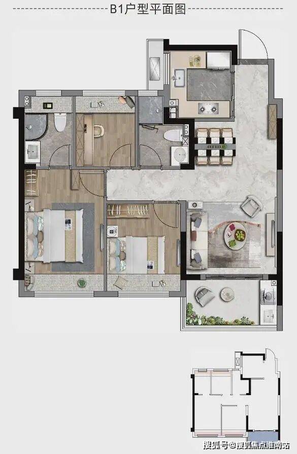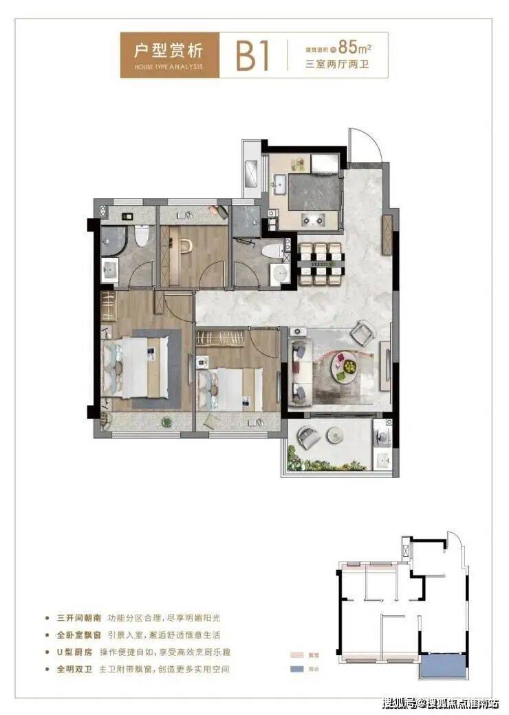 约85平三房户型,更是做到了三开间朝南,全卧室飘窗,拥有超大赠送面积,全明双卫,甚至主卫也附带飘窗,实用性拉满,而且该户型大部分房源总价在230万左右!