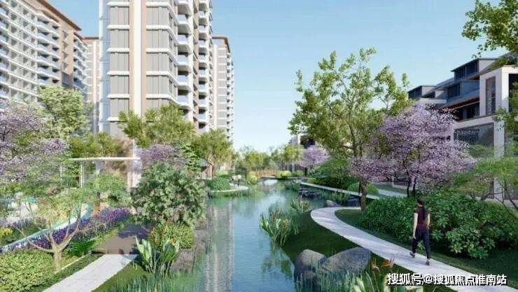 项目用绿带引水入园,将滨河公园“种”在社区,打造滨水、抱水的社区中央公园,形成叠墅区绿色岛居景观,筑造高品质墅区。