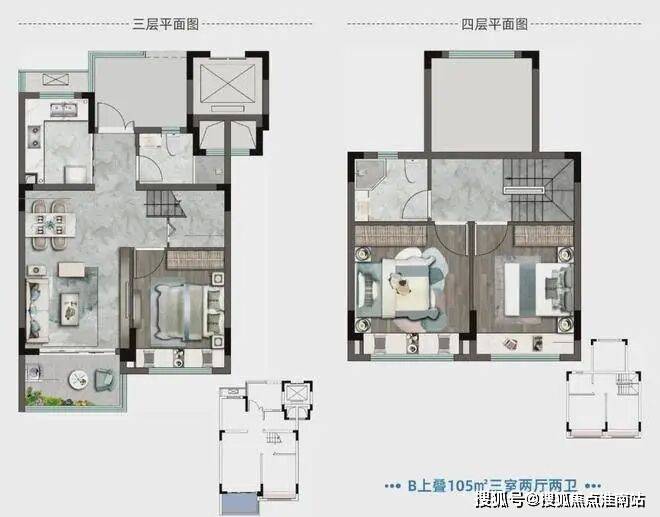 约123平上叠3房户型,共上下两层,全明设计,格局开阔,宽景阳台,上承天空,下承生活。
