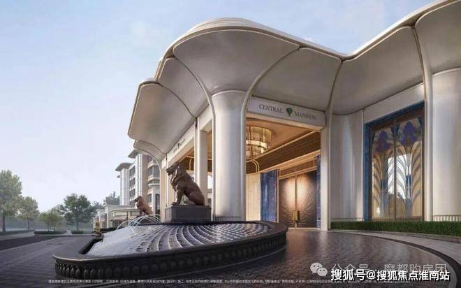 约65米环抱式落客前场,灵感源于“上海豫园-湖心亭九曲桥”,双尊威严铜狮静立、双株名贵金桂环抱一汪“尊华瑞鳞”水景,镇守家宅安宁,寓意流水生财。