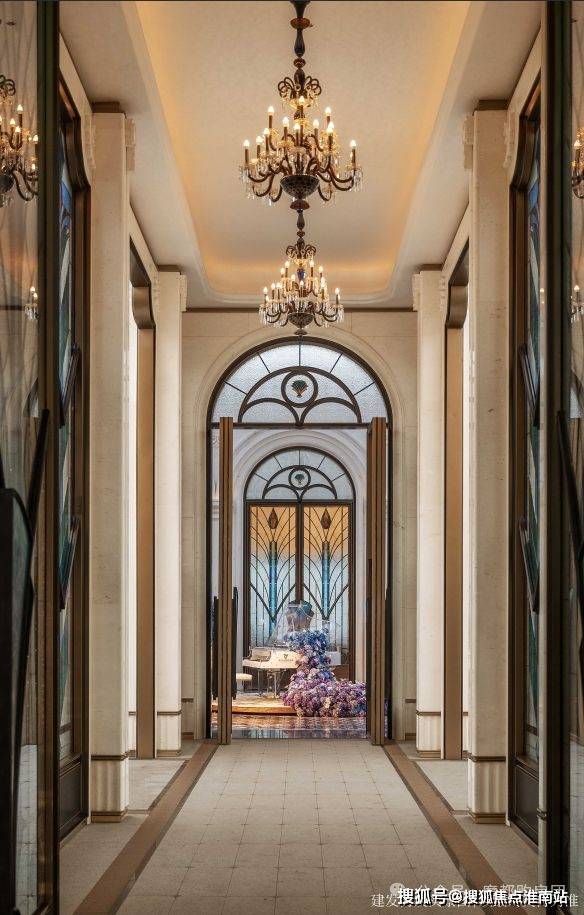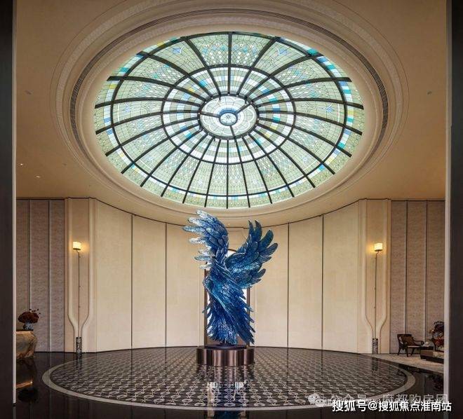玉兰门庭 」摩登飘逸,环抱式落客前场,大师定制 非遗掐丝珐琅门钹,流转温润光华,敬呈归家尊崇礼序,自此启幕生活的华贵序章。