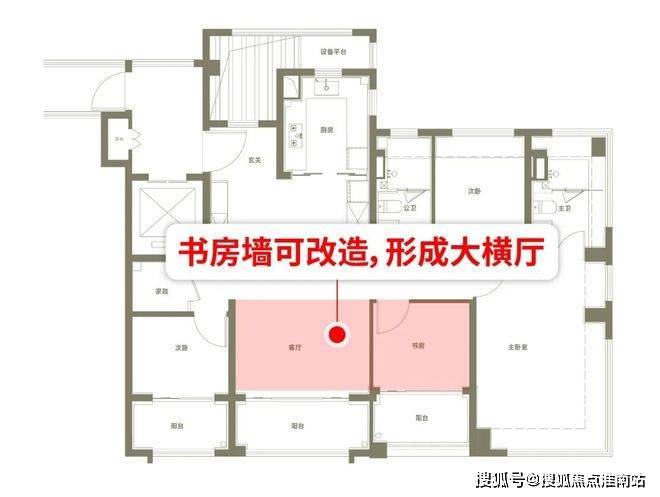 值得一提,靠近主卧的次卧与客厅之间的墙体可灵动改造,若打通则能形成约38平超大横厅,相当于常规180平户型客厅尺度,社交与生活场景随心切换。