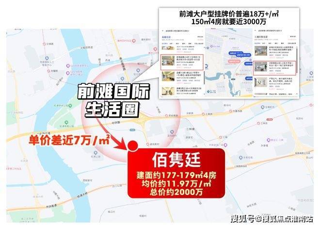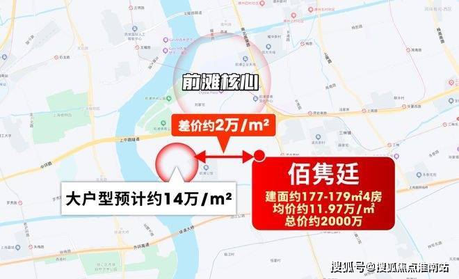先看与前滩核心二手房的差距。前滩二手市场看似均价15-16 万/㎡,但这基本是小户型的水平;真正稀缺的大户型,成长性早已拉开差距,普遍站到18万+/㎡。像晶耀名邸 150+㎡4房,挂牌价超19万/㎡,总价直逼3000万;九宫格的三湘项目,挂牌价更是达19-25万/㎡的高位。