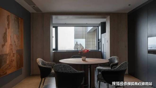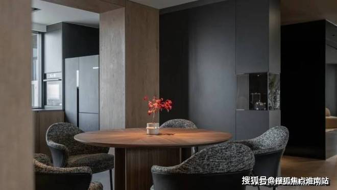 原木材质的圆桌,深色木纹与家中的暗黑色调相得益彰。每天傍晚坐在这里用餐时,还能有机会欣赏到客厅窗外“长河落日圆”的美景。