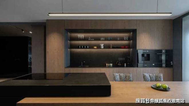 围绕着岛台餐桌的西厨区,不但可以直接欣赏到从客厅延展而来的江景,书房墙体和柜体之间留出一部分距离,也能窥见玻璃植物房的景观。