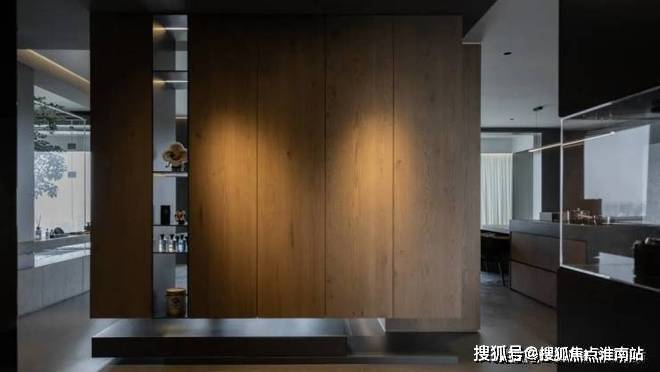 夕阳西下之时,晚霞和水面的波光映入客厅,穿过玻璃房来到书房、玄关,为暗黑系的公共空间带来可遇不可求的“限定皮肤”。