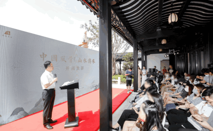 江南园林甲天下,苏州园林甲江南,比如像我们现在看到的园林布局,就是经典的苏州园林景观,讲究引水入园。造景围绕着这片水景展开,空间上比较有层次感。近景是流水、堆石,中景是连廊、假山,远景是中式合院的院墙、屋檐。