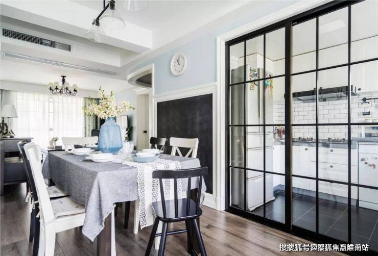 ▲ 餐厅与厨房以格子玻璃门相隔,配合一面黑板墙,通透之余不乏时尚趣味。龙珠公寓