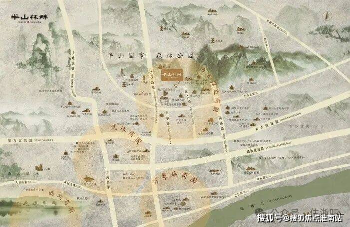 【项目四至】紧邻半山国家级森林公园 半山、龙山、虎山三大公园连通,组成一个大的半山森林公园,公园总面积约966公顷,总长23公里的游步道,森林覆盖率90.1%,空气负氧离子平均每立方厘米4000个,空气中细菌浓度也大大低于城区,森林公园多年平均气温16.5℃,年平均湿度80%左右,堪称杭州城区的森林氧吧