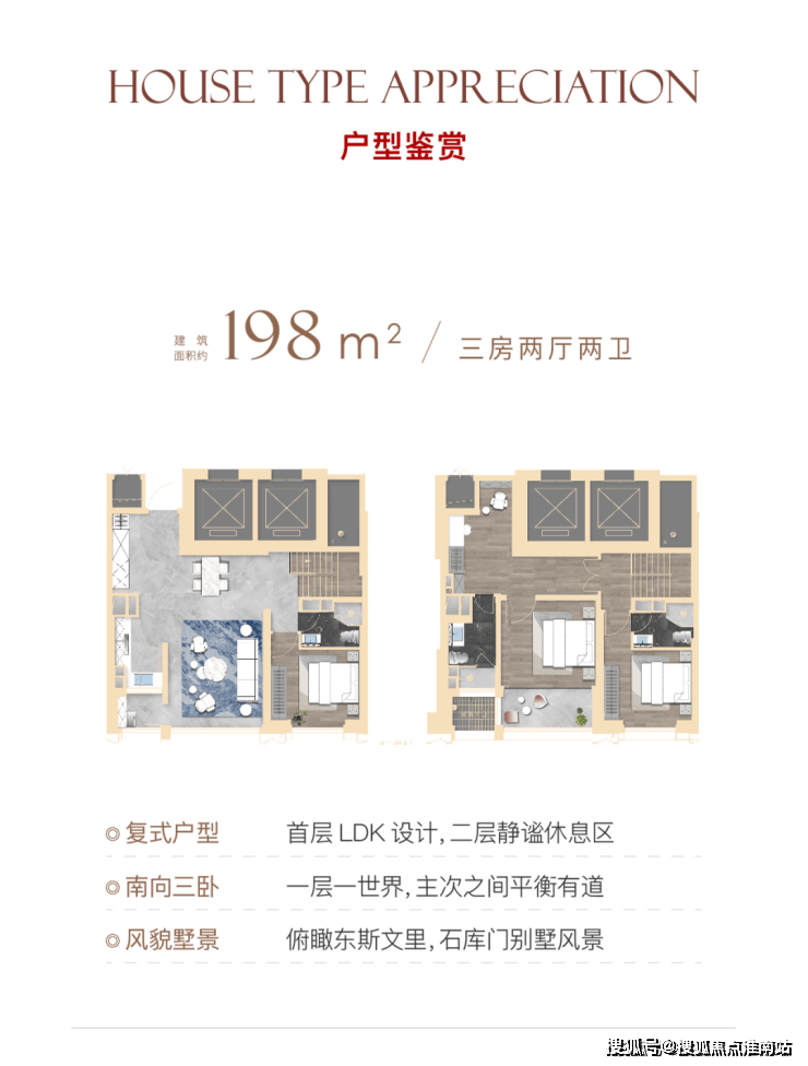 该户型只有极致景观楼层才有,南向景观面达约13.5米,无遮挡,南向两个卧室均有很好的视线通达性。