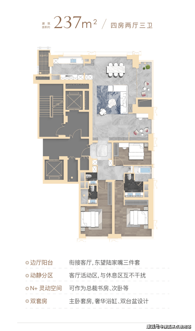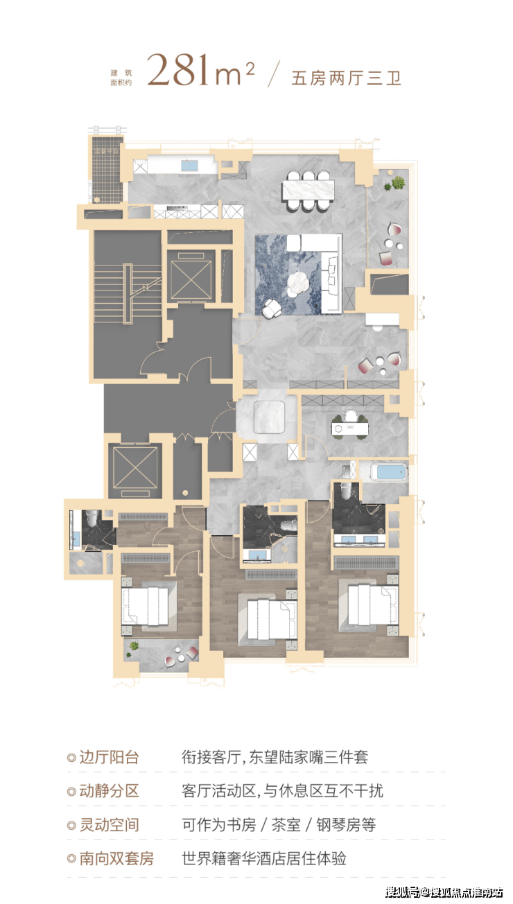顶豪社交空间格局,普遍只有餐厅、客厅和阳台,该户型在南侧配置了一个家庭厅着实巧妙,可以是业主的茶室,也可以是女主人的手工室,当然也可作为X空间,随家庭结构和需求随心定制,书房、学习区、游戏区,女王化妆间等皆可。