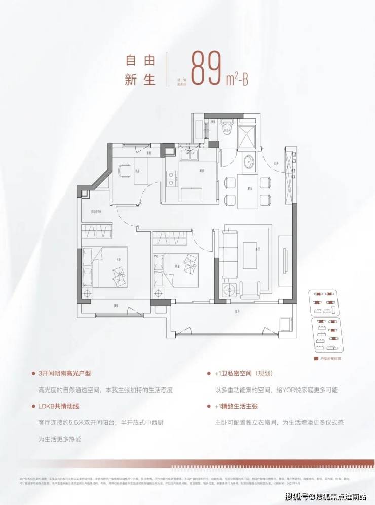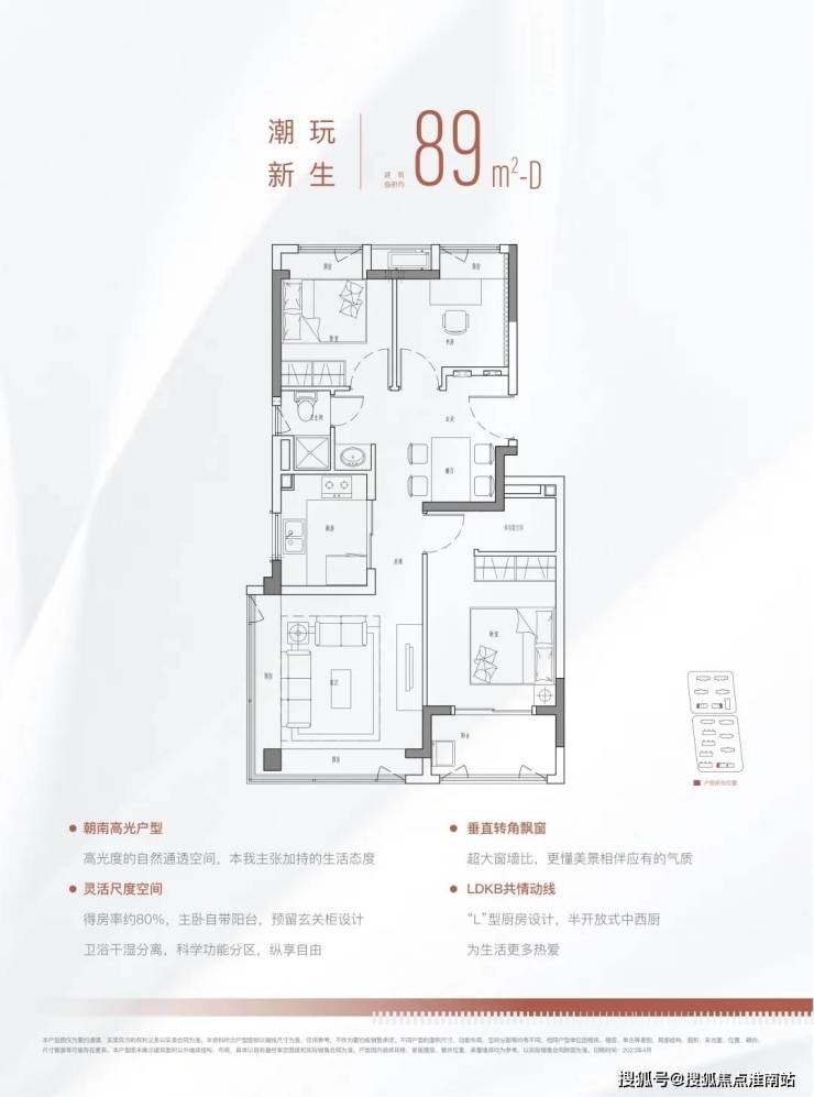 不同于一般的三房把这个小房间直接做了主卫,这个项目把选择权留给了购房者,并在下方铺设了上下水管、相当人性化!除了以上亮点之外,这个户型还有惊喜小细节。为了解决爱买买买的年轻人收纳痛点,户型设计上保留了厨房最大的收纳空间,可以打双组吊柜。在主卧和次卧都预留了收纳柜的位置。除了三开间朝南的经典户型,89m²还做了三面通风的户型。