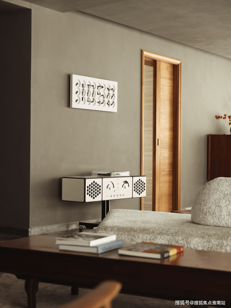 大面积的灰色,通过原木色的衬托给空间带来温润的质感,个性的家具(Brionvega复古微笑机器人音响,Eternit纤维水泥茶几,Herbst中古木凳,ClockClock跳跃指尖数字钟)成为空间的点缀色。