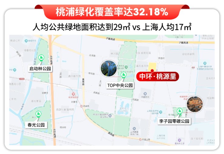桃浦绿化覆盖率达32.18%,人均公共绿地面积达到29㎡,远超上海市人均公共绿地面积。