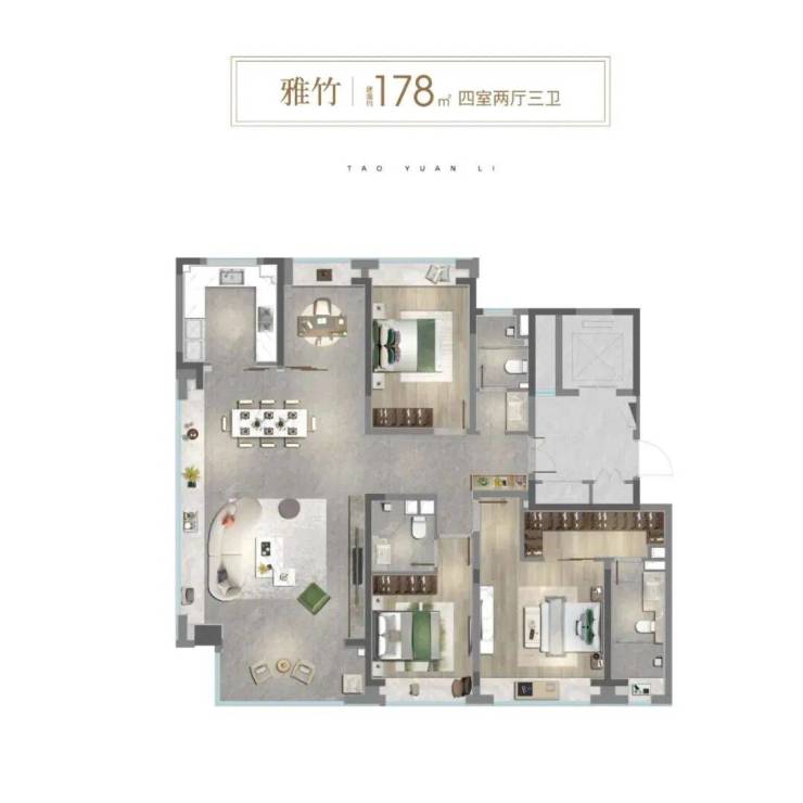 同时,项目通过“新桃源会客厅”(社区广场)、“独立社区会客大堂”、“林荫归家步道”、“中央景观聚场”、“品质入户单元(标志性景墙+专属入户铺装)”、“首层精装大堂”六大空间节点,打造仪式感与自然意趣交融的归家动线。