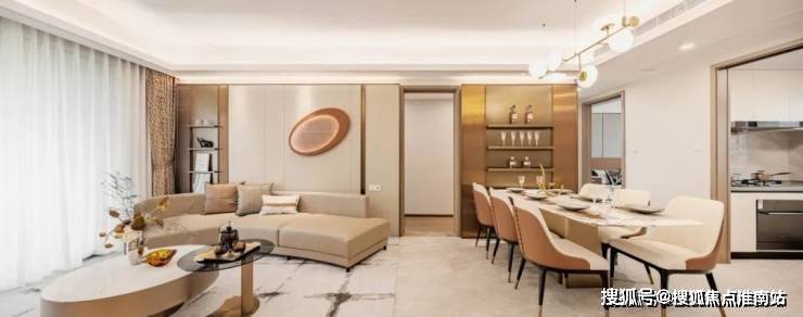 一体化餐客通厅,连接盛景阳台,闲暇时,孩子在客厅弹奏钢琴,父母在厨房准备晚餐、老人在阳台莳花弄草,置身不同空间,家人却可以视线相交、亲密交谈。