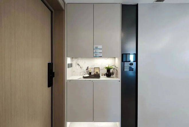 从进入门的那一刻开始,就感受到这套户型的改善之处:独立入户门厅,外加独立储藏空间,给予了业主归家的仪式感,也保证了私密性。