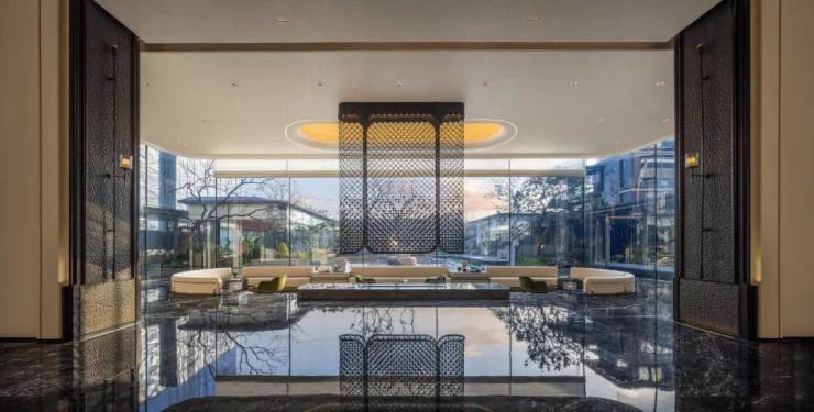 穿过华贵门廊,一境登门庭入府,超阔的接待前场是贝母形大理石地面铺贴纹路,头顶是透光云石弧形穹顶,正前方是皇室杈木影壁,接待台背部静置着“蓝翡翠”奢石背景屏风,以及与下沉水院一体的“三生石”造景,处处流露着优雅的艺术场域。