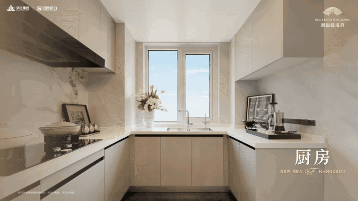 厨房是烟火与美学的共生之地。芬迪白岩板背景以一体切割工艺呈现,纯粹肌理如冰雪消融,油污一擦即净,让洁净成为烹饪的底色。定制手摇窗轻旋即开,为料理时光注入从容质感。