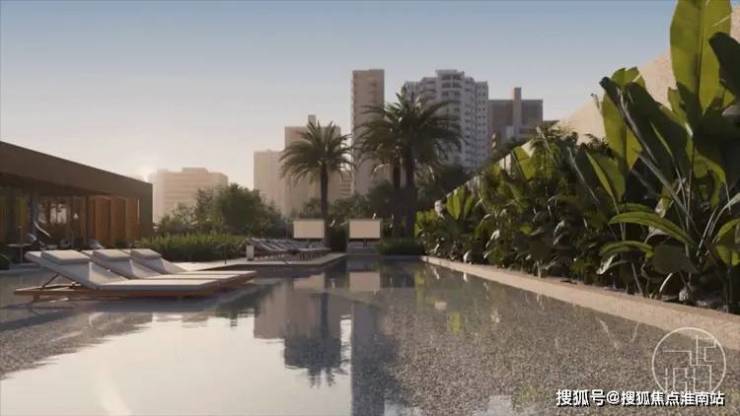 户外还额外设有一座降温水池,池中央摆放休闲躺椅,周边多选栽热带性的宽阔叶植物,有效软化了外侧坚硬的围墙。