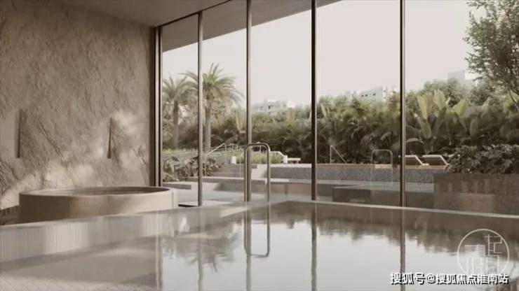 泳池边靠窗一侧的水疗池可望向窗外美景,粗糙的文化石墙面肌理与光滑水面形成鲜明对照。
