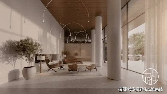 宽敞明亮的公寓大堂选用天然石材、高级木料装饰内部,旁侧摆放一株株充满活力的绿植盆栽,在通高的木纹天花板下营造出独特气氛。