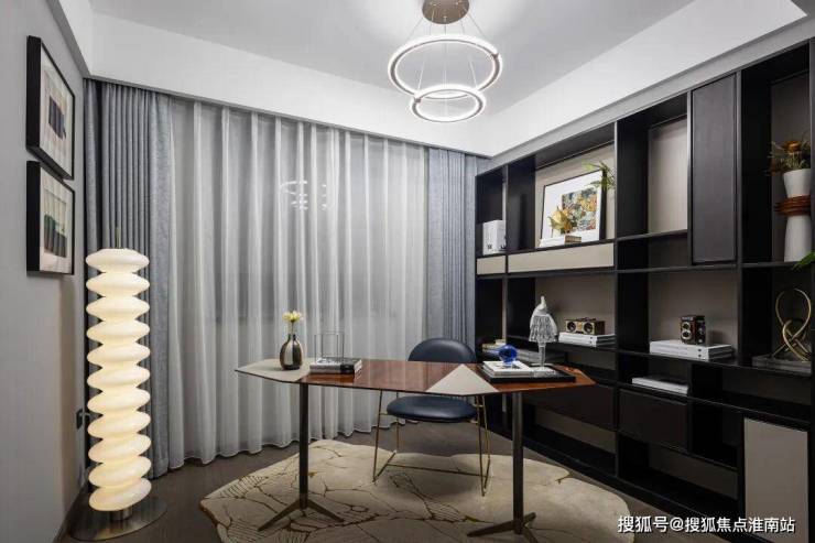 儿童房,飘窗与床边以小几相连,可以作床头柜也可以做书桌,实用又巧妙。金属灯饰如星轨排布,给人仰观宇宙之大的浩瀚之感。灰色墙面、黑色百宝格,拙朴低调自然沉静,无杂色迷眼无杂声乱耳,书房的设计既适合阅读、冥想、放空的私人空间,也适合临时处理工作事宜。