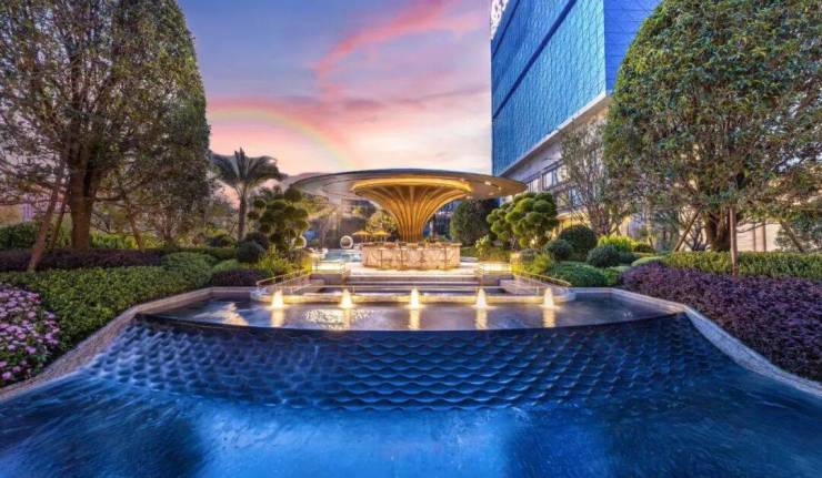 中央水景实图:景观灵感源自著名珠宝品牌CHAUMET,以“繁花造型珠宝”为设计理念,将大胆、华丽、创新于景观之中,形成特有的珠宝风格景观设计系统。