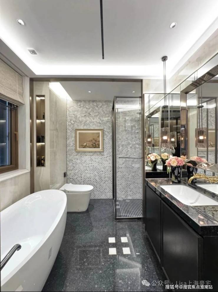 Prada绿奢石镶嵌于门厅与水景,地面铺装与建筑立面相呼应,菱形地花+海棠纹镶钻拼花,入户铺贴范思哲黑奢石。