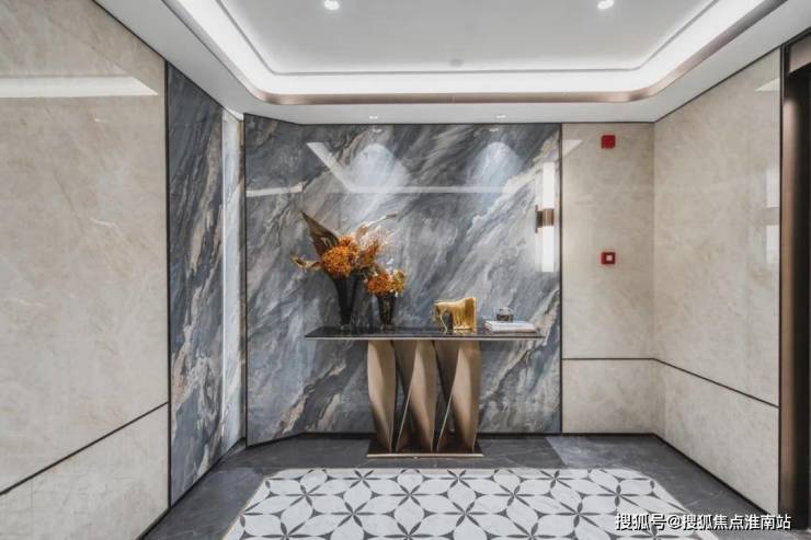 精致的迎宾水景、苍劲滴翠的罗汉松,为城市的界面,增添一抹亮色,也让当代年轻人,在享受现代都市生活的同时,感受到家的温暖和亲切。蓝翡翠的奢石,以深邃幽远的尊蓝色基底,尽显光彩下的神秘奢华;而顶部异形的仿铜星空顶设计,用香槟金色斜角造型铝板搭配熠熠灯光,碰撞出科技与艺术的美学。