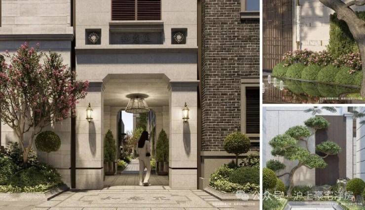 贯彻 “中意西景、中正西融”景观理念,以中式花园隐居哲学核心,传承中式里弄记忆、融合西式花园情调。提取场地四种建筑和场域风格特征,营造 中西风貌交叠的别墅花园景观,演绎当代海派风情里弄人居。