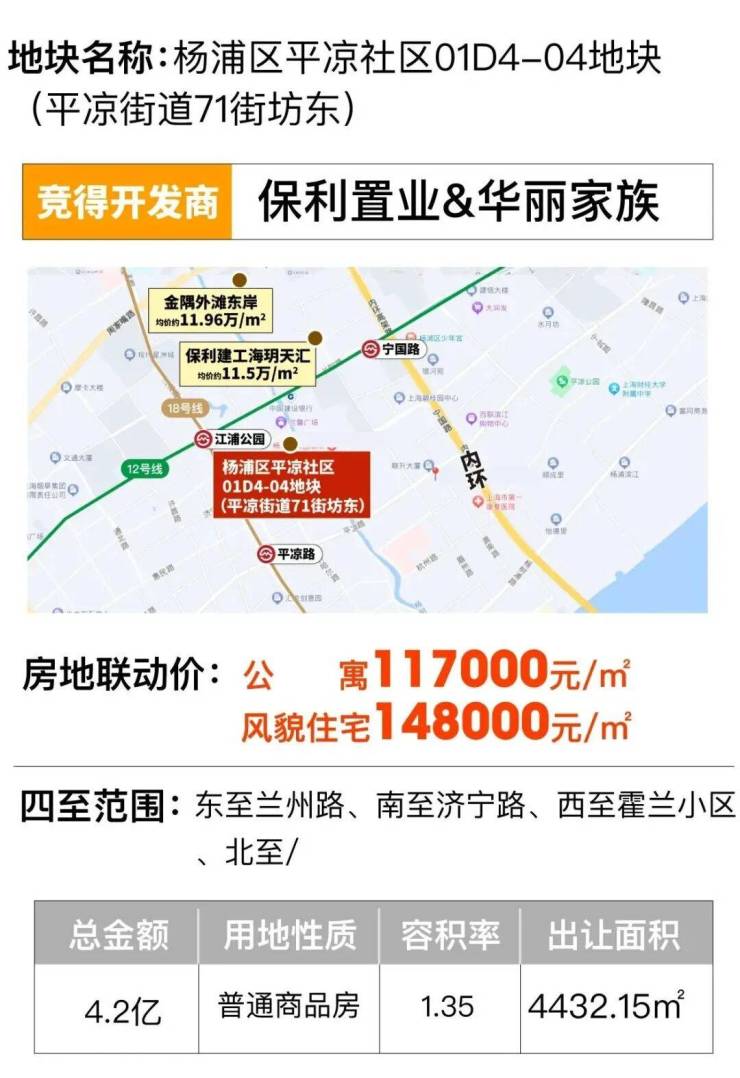 2023年12月5日,杨浦区平凉社区01D4-04地块(平凉街道71街坊东)以底价出让,华丽家族和保利置业联手拿下。该地块容积率1.35,高层联动价11.7万/㎡,风貌别墅联动价14.8万/㎡。
