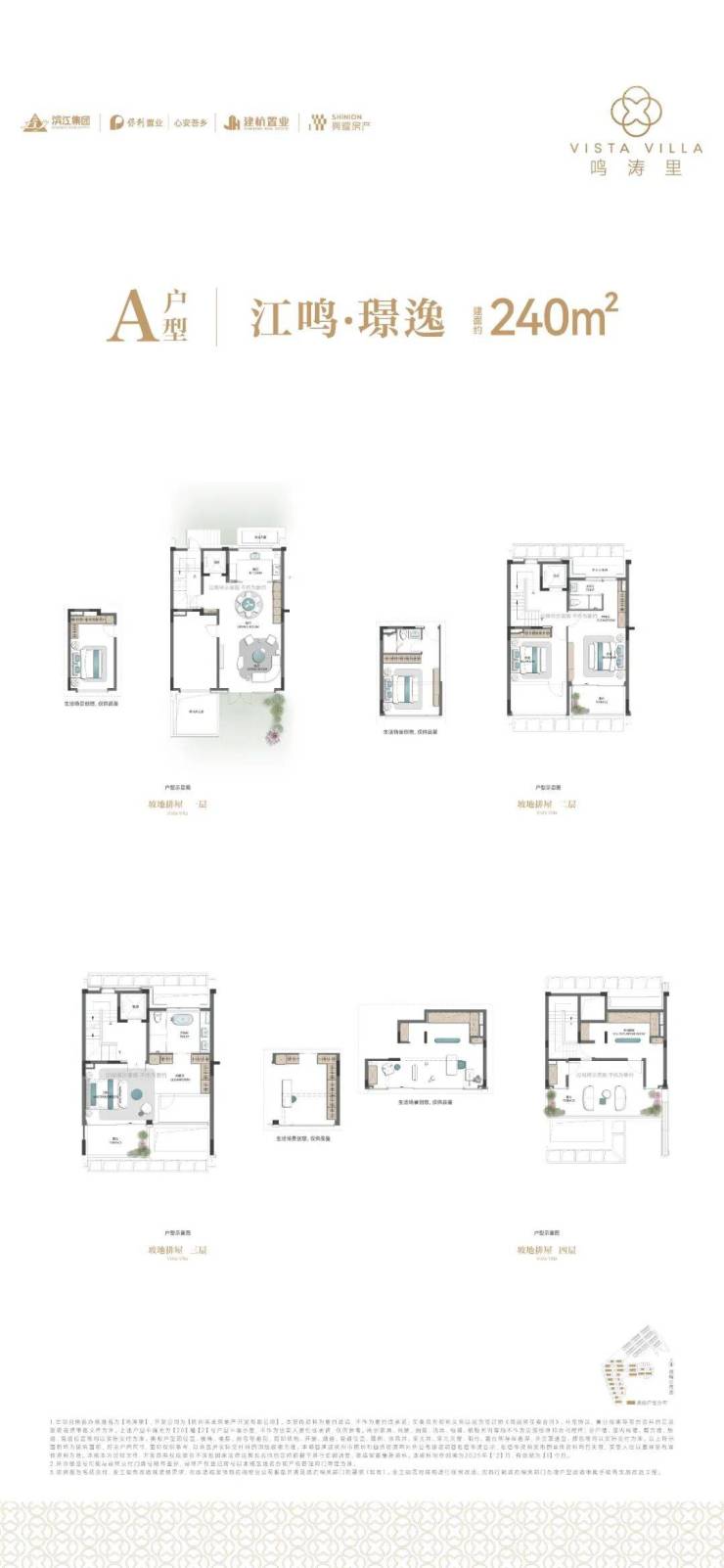 我们以 建面约240方起步户型 为例,约8.4米阔绰面宽,全套房设计,首层LDK空间面积约50方;二层双套房朝南,三层一整个主卧套房,南面连接大露台;顶层家庭会聚空间,还有超大星空露台……