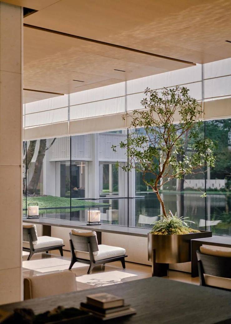 窗边一列座椅临光而设,长桌上方垂着素简的吊灯,几丛小盆景在桌面上静静生绿。另一侧,沙发以闲适的姿态倚着空间,不过分引人注目,却让整个场域流动着温润的接纳感。