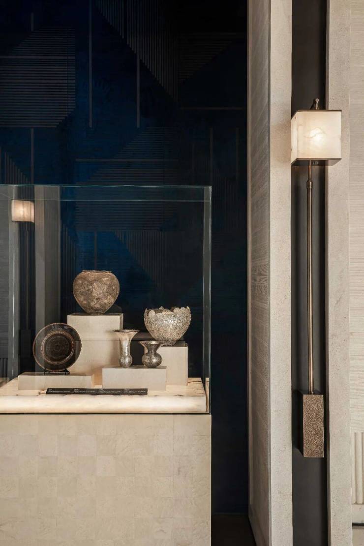 开阔视野将庭院景致无缝衔入室内,葱郁绿意成为空间里鲜活的画作。风摇叶动,光影随之起舞;雨落窗棂,自然韵律轻叩心扉,模糊了内与外的界限。光在此停驻,风在此徘徊展示柜静立此处。玻璃层板盛着均匀柔和的光,像一道空气屏障,完美展示了艺术品本身。它们被这光轻轻托着,各自沉淀在自己的位置里,像是被时间浸润,巧妙的融入空间的大片留白中。