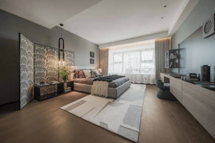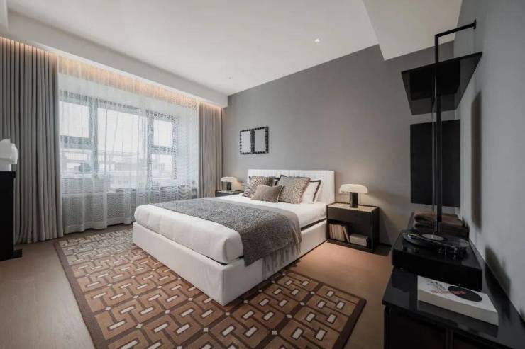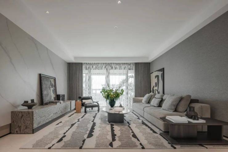 墙面则升格为云朵拉灰天然石材,低调奢华的品味油然而生。