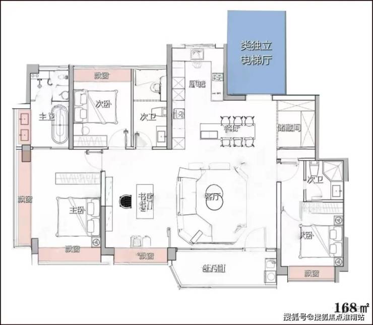 在这次翡雲悦府的最大户型升级里,就是做到了非常夸张的「赠送面积比」,户型图上红色部分都是不计入建筑面积的区域,三面全飘窗带来了完全不同的居住体验。