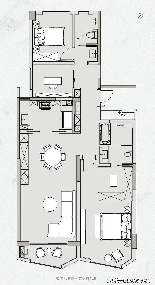 建面约150㎡C户型做到了主卧套房+全明双卫配置,功能性和尺度感的完美结合。主卧套房设计,带独立衣帽间以及休闲阳台,专属于主人的私密空间。该户型可以满足业主从二人世界到三口之家,再到二胎家庭的全生命周期需求。