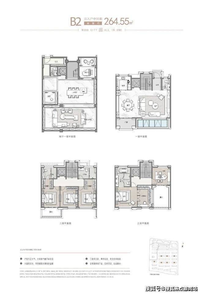 户型设计:联排别墅为地上三层,地下两层设计,约10.7米大面宽,6米挑高地下室,南入户边套地下室为三面采光,中间套为双面采光。一层是会客区,可配置老人房;二层休息区可做到全朝南3房,部分户型有双套房设计;三层是主人私享区,有书房、衣帽间、主卧及露台。