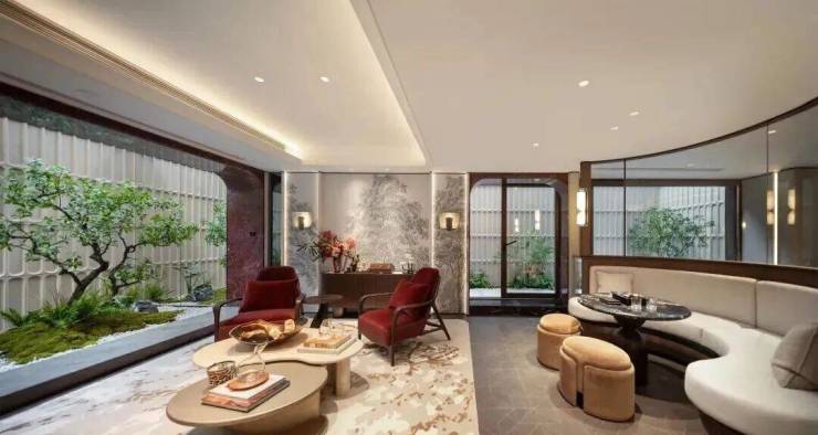 庭院中央采用巴西进口亚马逊绿奢石打造的流水景台,单价高达约4000元/㎡,配合灵感源自复兴公园紫藤廊架的景墙,潺潺水声与静谧光影,共同凝筑成一个静谧诗意的角落(项目红线外不作为交付承诺)