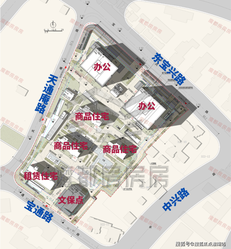 项目地块形状为不规则梯行,南北方向较长,将用地分成南北两部分,其中北侧布置商办组团及历史建筑,南侧布置住宅组团及综合配套(文保点)。