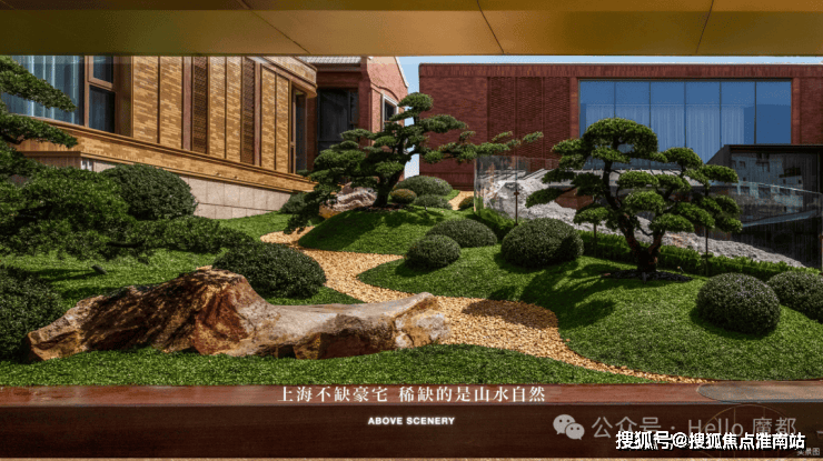 山水庭院汲取《足立美术馆》的造境手法,以老石皮、百年古木原样搬运,重现山间岁月的自然痕迹,与庭院中的光影交织,仿佛将山间的自然采光与静谧之感搬入城市。阳光透过树梢洒落,石皮上的纹理在光影中若隐若现,宛如一幅流动的自然山水画卷。
