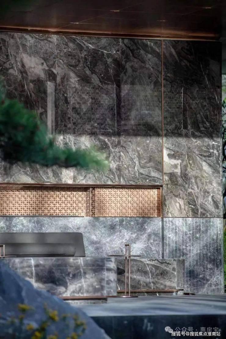 星空连廊的顶面采用香槟金铝板、墙面为爱马仕灰仿石砖,并镶嵌金属线条、就连地面都采用了夜里雪仿石砖第四,由石材&铝板构筑的第二景观会客厅!