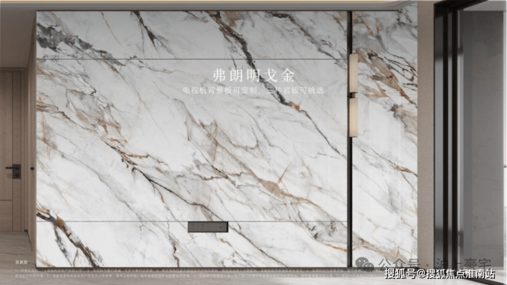 充分考虑业主的个性化需求,在电视背景板提供了新潘多拉、云中翡翠、弗朗明戈金三种结晶釉面岩板选择,成本更高,施工难度也更大。