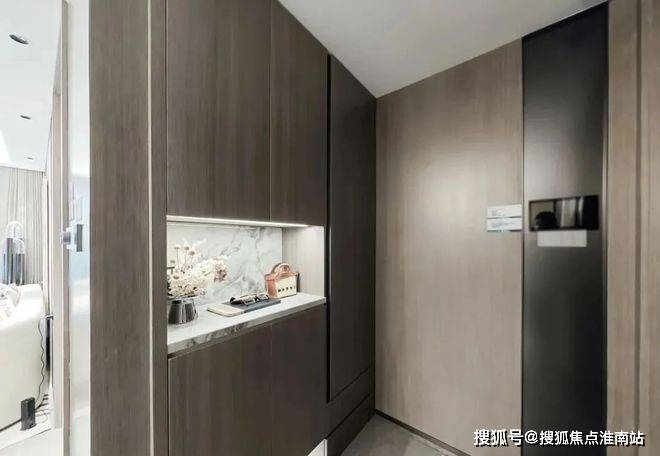在细节上同样不遗余力。比如入户后的玄关柜是交付标准,打开厨房柜体、镜柜等各类收纳空间时均有惊喜;再如客厅和主卧均采用弧形吊顶,还有风暖浴霸、玄关顶面感应灯等细节,都透露出项目对品质生活的追求。