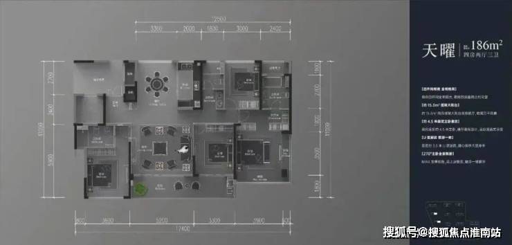 户型优点:186平做到了4开间朝南,而且居然还是3卫两套房,而且还是边向厨房,标准南北通透,北侧居然有生活阳台,一梯一户隐私性强。