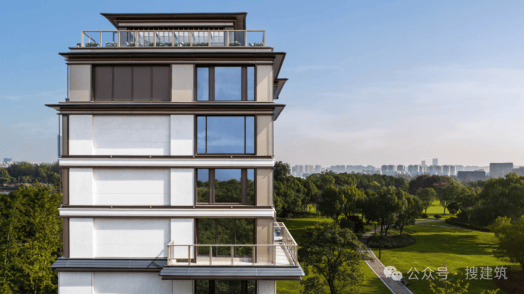 建发·璟园的立面设计,源自对宋式建筑体系的深度溯源。项目团队借鉴北宋壁画中的楼阁形象、兼取苏州现存建筑及园林中的楼阁元素,加以提取简化与演绎,形成“三阁并联”的立面语言。