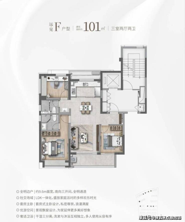 而且项目的高层户型都是建面约101㎡3房,客户选房无需纠结全部都在射程范围之内,未来统一圈层,邻里交流更顺畅!