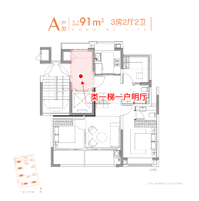①、建面约91㎡3/2/2,小户型也有大格局