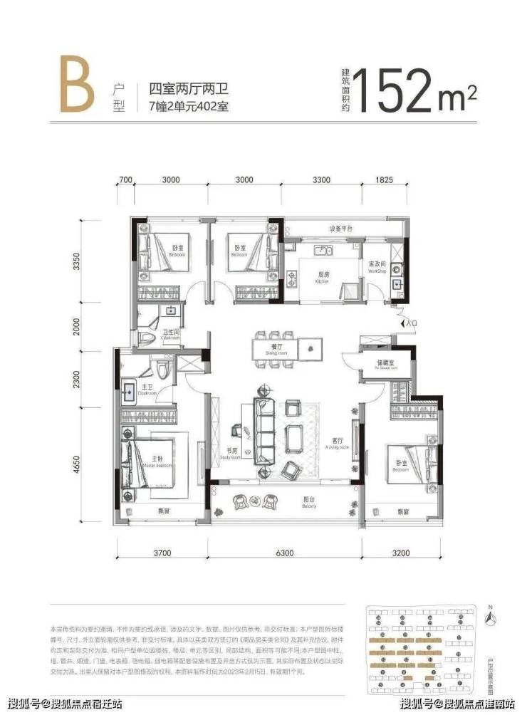 约152㎡的四房两厅两卫户型星创云珹府售楼处电话☎:400-998-9694✔✔ ,尺度比116/129㎡更加开阔,北向多了一个家政和储藏室的空间,更能满足改善人群的居住需求。